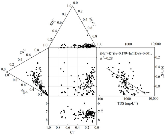 The anion was dominated by HCO3− (Figure 2), with an average concentration of 11.05 meq/L (Table 3), accounting for 67.68% of the total anion concentration (TZ−), followed by Cl−, with an average concentration of 4.45 meq/L, accounting for 27.28%. The concentrations of SO42− and NO3− were relatively low, accounting for only 4.09% and 0.97% of the TZ−, respectively. Na+ dominated the cations, with an average concentration of 10.79 meq/L, accounting for 66.59% of the total cation concentration (TZ+). Second, the concentrations of Mg2+ and Ca2+ accounted for 18.53% and 11.70%, respectively. The K+ concentration was the lowest, accounting for only 3.16% of the TZ+. The ion concentration sequences of Cl− > SO42− and Mg2+ > Ca2+ in the shallow groundwater of the Yancheng area were significantly different from that of the Guohe River basin in the upper reaches of the Huaihe River (SO42− > Cl− and Ca2+ > Mg2+) [31], indicating that the formation mechanism of groundwater solutes in the upper and lower reaches of the Huaihe River could be different. Moreover, significant differences in the chemical parameters between samples were observed through CV, SD, and extreme values, which reflected the different chemical evolution processes of groundwater in the study area, and solute sources were controlled by multiple factors [1,10].