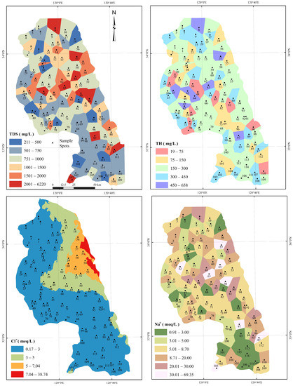 Spatial distribution of TDS, TH, Cl−, and Na+ in shallow groundwater.