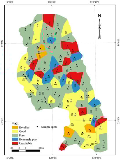 The DWQI is a widely used drinking water quality assessment tool [6,10,11]. The calculated DWQI value was presented in five classification categories by ArcGIS 10.7 software: excellent water (DWQI < 50), good water (50 ≤ DWQI < 100), poor water (100 ≤ DWQI < 200), extremely poor water (200 ≤ DWQI < 300), and unsuitable for drinking water (DWQI > 300) [11,23]. The calculation process for the DWQI is as follows: