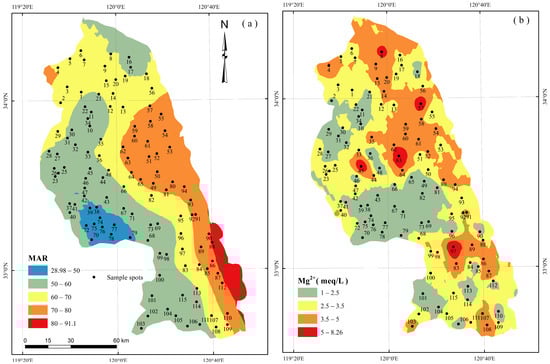 Spatial distribution of (a) magnesium adsorption ratio and (b) Mg2+ concentration.
