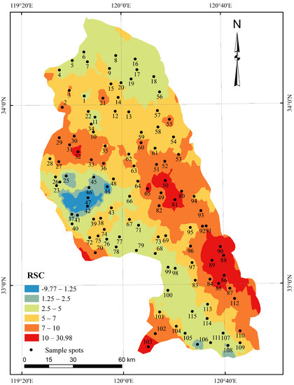 Spatial distribution of residual sodium carbonate (RSC) in shallow groundwater in the Yancheng area.