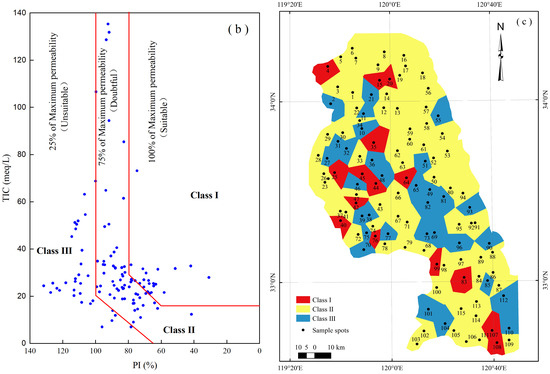 Soil permeability potential under different water quality background in theYancheng area. (a) Spatial distribution of permeability index (PI); (b) PI vs. total ion concentration (TIC); (c) Spatial distribution of sample classification results based on the relationship of PI and TIC.