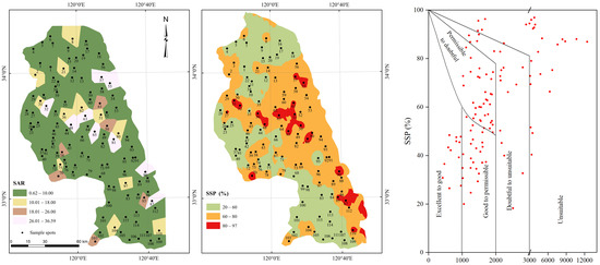 Spatial distribution of SAR and SSP and a Wilcox diagram.