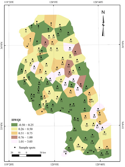 Furthermore, the integrated irrigation water quality index (IIWQI) was used to systematically evaluate the groundwater quality [26,27,28], and the calculation formula was as follows: