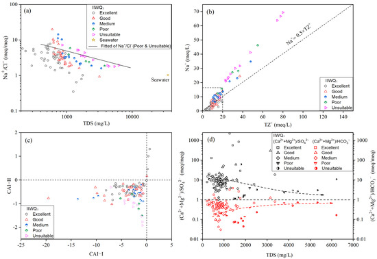 Plots of (a) Na+/Cl− vs. TDS, (b) Na+ vs. TZ+, (c) CAI-I vs. CAI-II, and (d) (Ca2+ + Mg2+)/SO42− (HCO3−) vs. TDS.