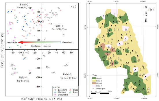Hydrochemical facies of groundwater in the study area based on the Chadha diagram. (a) Chadha diagram (Field−1: Ca–HCO3-type waters, reflecting recharge and weathering. Field−2: Na–HCO3-type waters, reflecting base ion exchange. Field−3: Ca–Mg–Cl-type waters, reflecting reverse ion exchange. Field−4: Na–Cl-type waters, reflecting evaporation or mixing with seawater); (b) Location of four types of the samples.