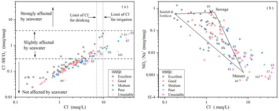 Plots of (a) Cl−/HCO3− vs. Cl−; (b) NO3−/Na+ vs. Cl−.