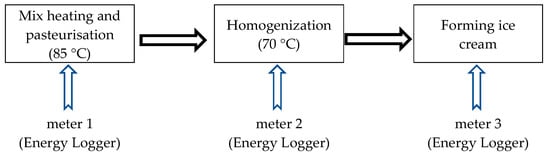 CF was determined in relation to 1 kg of product (functional unit). Energy Logger 4000 instruments and KE-N80 MID electricity meters placed in appropriate enclosures were used to record energy measurements. Emission and production data were recorded using the developed line metering system for seven ice cream mixes (one traditional composition and six different variants with fat and sugar substitutions). They were prepared under laboratory conditions in the amount of 2.5 kg, and three different ice cream mixes were prepared under industrial (handcraft) conditions. Based on the data obtained from measuring devices and production data, the partial and total CFs were calculated. CF analysis of ice cream production (with fat and sugar substitutions) was also carried out taking into account variable homogenization times (5, 15, and 25 min).