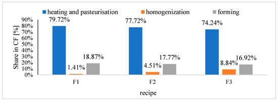 Tests for each recipe were carried out three times to ensure reproducibility of results. Based on the analysis of electricity consumption (Table 3), CF of laboratory-scale ice cream production was determined for 7 recipe formulations (Table 4). Under these conditions, the determined CF of the production of traditional ice cream (recipe 0) was 0.360 kg CO2 per kg of product, and for ice cream according to the recipe with fat (100%) and sugar (100%) replacements (recipe F) 0.385 kg CO2 per kg of product. A study of the contribution of unit processes in the production of ice cream according to recipe F was carried out in relation to the variable durations of these stages (Table 5). The durations of the various stages were limited to specific ranges that allowed the corresponding properties of the final product to be obtained. This allowed testing different times for heating and pasteurization (70, 75, 76 min), homogenization (5, 15, 25 min), and a fixed time for ice cream formation (80 min). CF ranged from 0.355–0.395 kg CO2/kg product. The largest share of CF of ice cream production with fat and sugar substitutes was the pasteurization process which averaged about 77% of the total CO2 emissions (Figure 2) and the smallest was for the homogenization process. The CF of homogenization, for different durations, was 0.005; 0.017; 0.035 kg CO2/kg of product, respectively.