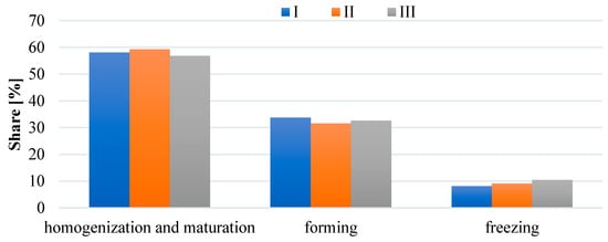 Under handcrafted conditions, 60 kg of ice cream was produced in one production cycle. The determined CF of the production of traditional ice cream and ice cream with fat and sugar substitutes was 0.253 and 0.248 kg of CO2 per kg of product, respectively. In contrast, for the standard handicraft recipe used at Primulator, CF was the lowest at 0.234 kg CO2 per kg of product. The homogenization and ripening process accounted for the largest share of CF in handcrafted ice cream production with different recipes and amounted to about 60% of the total CO2 emissions (Figure 5).