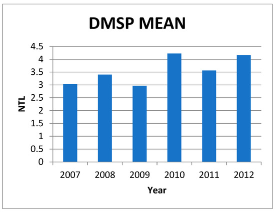 Data was selected centered around the two years with instances of GDP decrease, namely 2009 and 2015. In theory, should NTL data display a positive correlation as expected, then a negative growth in GDP should also be reflected in NTL. However, while the expected reduction across both GDP and NTL data did occur in the two focus years, NTL also showed a significant decrease in 2011 despite GDP’s increase in that year, displaying a negative correlation between GDP and NTL in contrast to the rest of the data in the time series. Thus, it can be said 2011 is the only outlier year in the data, falling out of line with the predicted results and therefore worthy of further analysis. As a result, despite an original outline of utilizing five-year spans centering on the instances of GDP decrease (2007–2011 and 2013–2017), 2012 was added to the DMSP data range for further analysis. The aim was to include the year after the outlier year to discover whether or not the pattern of negative correlation would or would not continue, and what effect the additional year would have on the regression analysis. Coincidentally, 2012 is the last year available in the DMSP data series, meaning the only option for further study was adding this singular year.