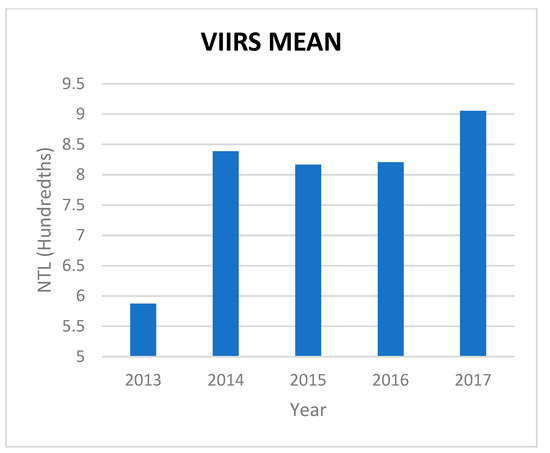 NTL data has been applied in a number of studies comparing it to GDP numbers among other indicators, meaning it holds potential as an additional indicator in assessing sustainable development policy. Knowing the efficacy of economic policy promoting sustainability can help policymakers to make more informed decisions and refine sustainable development measures. Aside from its usage as a verification method of traditional GDP data [2,6], NTL offers reliable insight into areas wherein data collection may run into issues on the ground level. One of the most notable and obvious areas of NTL application is in reflecting urbanization, an area well-documented in previous literature [8,9,11,14,15,16]. Research has shown that VIIRS NTL data has proven a more accurate tool in predicting GDP in comparison to its predecessor satellite in monitoring NTL data, DMSP [1,14]. Past research has found a correlation between NTL and poverty distribution [5] which attested to the reliability of NTL over traditional GDP metrics in identifying poverty areas in China. Similarly, one study utilized power shortage phenomena in Colombia to connect NTL decreases to fertility booms, which in turn led to correlation with worsened socioeconomic conditions for those families involved [17]. Yet another study on the current Yemen conflict demonstrated a distinct and significant decrease in NTL levels in Yemen after the outbreak of fighting, particularly in the western region seeing severe conflict [18]. This study in particular highlights the importance of studying substantial NTL loss due to the sudden, extreme nature of war causing the decrease.