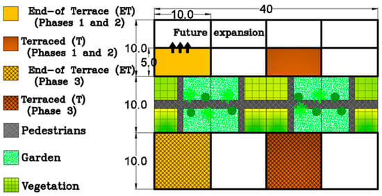 Next, based on the local urban planning systems in [42], the attached planning block systems have been modified and designed to consist of the plot layout for the prototypes in their various systems (horizontal and vertical) and phases (Phases 1–3). Additionally, pedestrians, gardens, and vegetation areas between the units were designed while there is a limitation in assessing its effectiveness through the utilized simulation software in this study. To Include horizontal-sited layout plot prototypes (Cases 2–5), the planning block system in Figure 2 was designed however to avoid extreme sprawl planning the vertical-sited layout in Figure 3 was designed for cases 6 and 7 typologies.