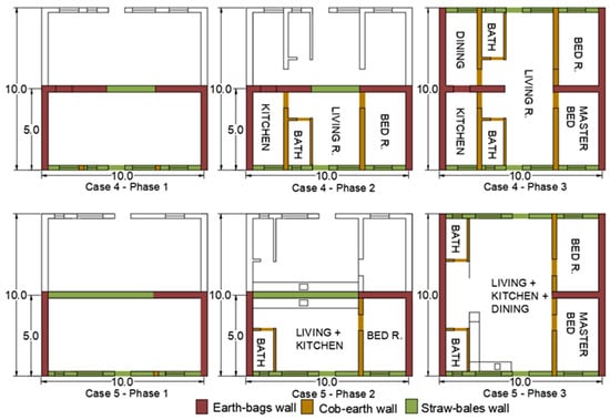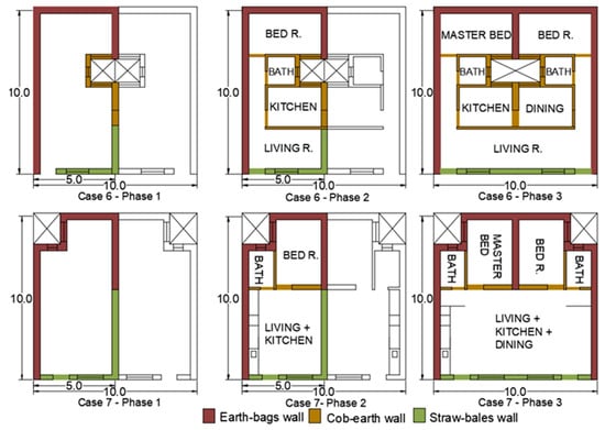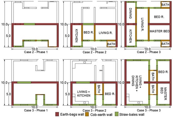 Concerning the design of the prototypes, the six Cases with an area of 50 m2 for each of them designed in the previous study [42] were considered phase two for the Cases developed in this paper (Figure 4, Figure 5 and Figure 6). Regarding the incremental phases study and after observation of the critical investigation of the previous literature and the cultural context two other phases have been modified from each of the six Cases. Phase one with the same area as phase two (50 m2) is considered the initial and temporary design phase, with simply one general zone for cooking, living, and sleeping excluding a bath in the prototype. The last design phase is three, it is an upgrade of phase two with an area of 100 m2 (Figure 4, Figure 5 and Figure 6), and to host 6 people instead of 5 people in the other two phases. This decision update has been taken based on the study of the cultural context after the site visit where it has been observed that many newly married couples stay with their parents after the marriage process for a few years. Consequently, phase three has been designed to host this type of family, newly married couples, or even to host low-income people when there is a chance for refugees to go back to their original homes. AutoCAD drawing programs were used to draw and illustrate both the planning and designing prototype systems.
