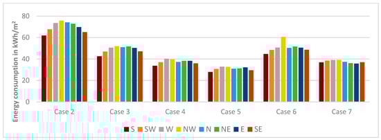 Ultimately, the assessing and evaluation process has been done for two reasons: to identify the best orientation through assessing energy in eight different cardinal and ordinal directions (Figure 7) and then to assess all the prototype scenarios in different incremental phases based on the best orientation. IDA-ICE simulation and Excel sheets software have been used to evaluate and calculate the performance of models. Concerning orientation, the second phase for the six Cases with the End-of-Terraced (ET) location has been selected for assessing energy performance annually through heating, cooling, and lighting categories while DHW and equipment were not considered due to the similarity in the results in all scenarios. As shown in Figure 7, the results revealed the superiority of the south (S) orientation while the worst direction was generally northwest (NW). Thereby, the next step of the study (assessment of the incremental phases) prototypes were established based on these results.