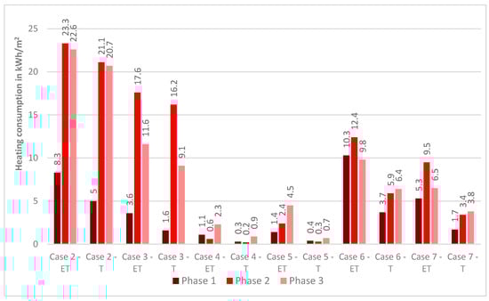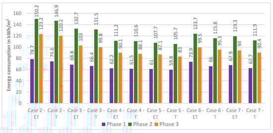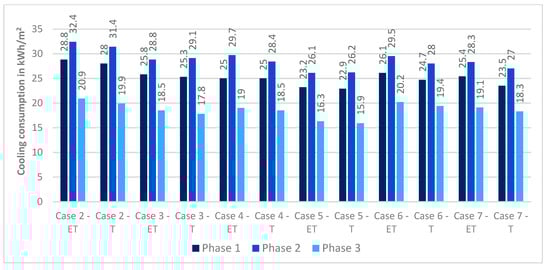 Concerning cooling energy demand even it has the biggest portion regarding heating-cooling consumption while conversely to the heating demand energy, there is a slight difference in the cooling demand results between the cases (Figure 10). For instance, the worst results for the three phases were for Case 2 in (ET) position and revealed (28.8, 32.4 and 20.9) kWh/m2 equivalent to (1013, 1161 and 1399) kW respectively while the best results for phase 1 and 3 were for Case 5 in (T) position interestingly for phase 2 was in Case 5 (ET) position as revealed (22.9, 26.1 and 15.9) kWh/m2 equivalent to (970, 1053 and 1325) kW respectively. This slight superiority for (ET) position over (T) one in Case 5 (Phase 2) was due to the overheating in winter which results from their compact shape, heat emissions from equipment in the open (studio) layout design system, and superinsulation technique.