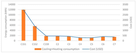 To realize more effect of applying low-impact construction (LIC) materials and techniques through the bottom-up method besides the effect of the designed prototypes on saving energy, the cost of heating-cooling energy has been countified (Figure 11). The assessment focused on phase 2 and End-of Terraced (ET) position for all the six designed Cases and base Case one (S9) with it is targeted bottom-up method to be compared with both base case scenarios (S1 with zinc sheets roof and concrete blocks wall and S2 with sandwich panels roof and concrete blocks wall) in [41]. Furthermore, the energy value has been quantified as 1 USD for 4 kWh based on the recent policy reform announced by the Kurdistan Regional Government (KRG) concerning energy pricing [54]. In conclusion, the assessment revealed that the best and worst results for designed cases (Cases 5 and 2) compared to (S1) can save 10,809 and 10,133 kWh equivalent to 2703 and 2534 US Dollars annually, additionally comparing to (S2) both cases can save 4469 and 3793 kWh equivalent to 1118 and 949 USD annually.