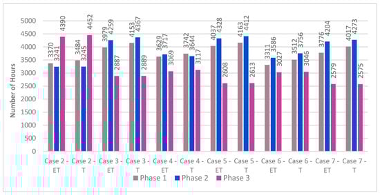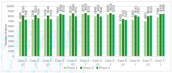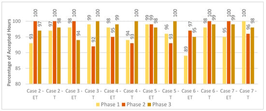 The representative accepted category hours’ percentage ratios in Figure 12 have been quantified based on Equation one, after assessing different zones with it is different occupancy hours annually. Depending on the range of specified setpoint temperatures in the modeling software (IDA ICE), the “accepted“ hours were performed. Concerning the “accepted“ hours’ ratio assessment for phase one at the End of Terrace (ET) position, the best and worst performed cases are (Cases 5 and 6) with unaccepted ratios of 0.74% and 11% equivalent to 65 and 964 h while in Terrace (T) position were (Cases 7 and 4) with unaccepted ratios 0.10% and 5.60% equivalent to 9 and 491 h annually. Moreover, concerning phase two in (ET) position, the best and worst performed cases are (Cases 7 and 4) with unaccepted ratios of 0.10% and 4.85% equivalent to 8 and 355 h while in the (T) position were (Cases 6 and 3) with unaccepted ratios 0.09% and 7.87% equivalent to 7 and 610 h ratio annually. Likewise, regarding phase three in (ET) position, the best and worst performed cases are (Cases 4 and 3) with unaccepted ratios of 0.63% and 6.41% equivalent to 41 and 500 h, while in the (T) position were (Cases 4 and 7) with unaccepted ratios 0.38% and 2.12% equivalent to 25 and 167 h ratio annually. The best and worst Cases performance results when changing position from (ET to T) revealed that Case 6 (+771 h) and Case 4 (−323 h) for phase one, also Case 6 (+192 h) and Case 3 (−580 h) for phase two while, for phase three, Case 3 (+463 h) and Case 7 (−60 h).