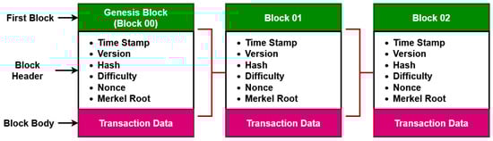 A block of data saved in a blockchain can be thought of as a write-once, read-only database; some important data recorded in a block is shown in Figure 3. Each block is divided into a header and a body, and a hash is used to identify each block. The metadata, which includes the timestamp, version, hash value, difficulty, nonce, and Merkel root, is kept in a block header, as illustrated in Figure 3. When a block is added to the blockchain, its timestamp serves as both a reference point and verification of its addition. The used version of the blockchain is indicated by version, in which version 2.0 and 3.0 are typically used for the decentralized and smart contract application systems. Applying a cryptographic hash function to the data is the process of hashing. The fundamental building element of a blockchain network is a hash function, which transforms incoming data into a string of bytes with a predetermined length and structure. The miners are in charge of creating new blocks, and each block includes a hash that connects it to the one before it. The hash rate of the network and the number of mining nodes determine how long it would take to add a new block of the transaction to the blockchain. This value is called the difficulty. The network is more secure, and the processing power required to validate transactions increases with difficulty. A 32-bit random number, called a nonce, which stands for “number only used once”, is used for identification, hashing, verification, or digital signatures. A mathematical method that condenses the transactions in a block is called a Merkle root. It checks to see if information in a Merkel tree has been altered, hacked, or changed in any way. Business information, including the transaction counter and the transaction details, are contained in the block’s body.