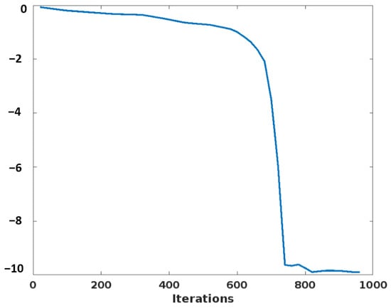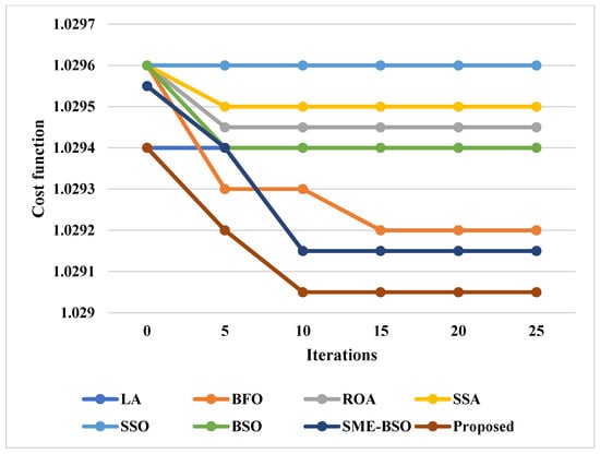 Here, the optimization efficacy of the proposed PCGS algorithm is validated according to the parameters of the best score, fitness plot, and searching history. As shown in Figure 6, the best score obtained by using the proposed PCGS mechanism concerning different iterations is validated. Solving problems with many variables and restrictions is typically a time-consuming and difficult task. Moreover, many local optimum solutions do not ensure the greatest outcome when utilizing conventional numerical techniques. Therefore, the PCGS technique is utilized in the proposed work, which obtains the best optimal solution for generating a key to perform data sanitization. The observed results indicate that the PCGS reaches the best score with a minimal number of iterations. Similarly, the fitness plot and search history of this optimization technique are represented in Figure 7 and Figure 8, respectively. Then, the convergence analysis is depicted in Figure 9. The objective score that represents the average of all particles during each iteration is known as average fitness. It demonstrates how the proposed PCGS algorithm enhances the optimum accuracy during simulation runs. Moreover, the PCGS algorithm explores the whole search space and does not get caught in local optima. The distribution of sample points is centered on the actual optimal solution, ensuring the viability of its application. Thus, the proposed PCGS is capable of both exploration and exploitation. Overall, this analysis indicates that the proposed PCGS provides better performance by effectively identifying the best fitness, with minimal iterations in the search space.