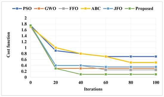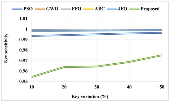 Figure 10 compares the optimization cost of the baseline and proposed optimization algorithms with respect to a varying number of iterations. In order to validate the performance of the proposed PCGS optimization technique used for key generation, the convergence rate, cost function, and key sensitivity have been estimated. Moreover, the effectiveness of the blockchain integrated privacy preservation model used in the SCM is validated and compared using the utility and privacy parameters. Overall, the estimated outcomes state that the PCGS model provides an improved and reliable outcome, when compared to that of the other techniques. The cost function is a performance metric that expresses the viability of the proposed work. The PCGS outperforms the other baseline models with a lower cost function, as shown by the results. Due to its improved exploration and exploitation capability, the results of the proposed PCGS are effectively improved in this work. Moreover, the key sensitivity is validated and compared to key variation (%), as shown in Figure 11. By changing the percentage level of the key from 10% to 50%, the ideal key sensitivity is assessed. The obtained results indicated that the PCGS effectively minimized the key sensitivity for all variations. In addition to that, the correlation coefficient is also validated and compared to the variation of the key (%), as shown in Table 3 and Figure 12. Moreover, there should be little correlation between the sanitized data and the key, with deviation. When compared to other conventional models, the proposed scheme achieves the lowest correlation, as illustrated by the graphic in Figure 12. Moreover, the correlation obtained by the proposed PCGS is 0.5%, which is significantly better than that obtained by other approaches.