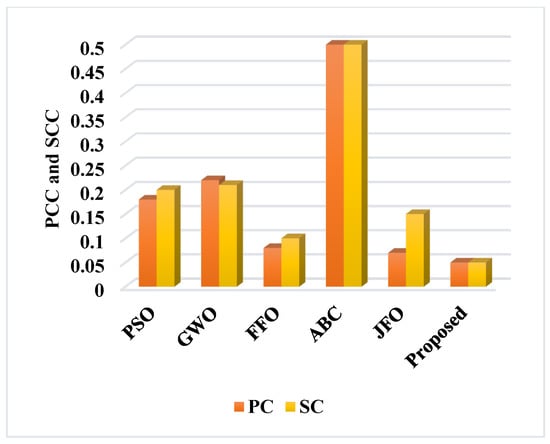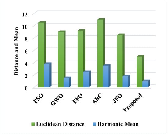 Figure 13 illustrates the findings obtained after comparing the Euclidean distance between the existing and proposed methodologies. When compared to the other works, the proposed study shows the lowest Euclidean distance for the given logistics dataset. It also shows the results of computing the Euclidean distance in terms of harmonic mean. This analysis also indicates that both the Euclidean distance and the harmonic mean have been effectively reduced in the proposed work when compared to the other baseline models. In addition, the Pearson coefficient (PC) and the Spearman coefficient (SC) of the baseline and proposed optimization models is shown in Figure 14. A set of the expected data’s arithmetic mean is calculated by dividing the total number of observations by the sum of all the numerical values for each observation. Here, the arithmetic mean is validated in terms of PC and SC. For an effective and secure data transfer, both PC and SC must be low. When compared to the current models, the PC and SC of the proposed work reveal few variances. However, as a whole, it is claimed that the cost function’s overall target is lower, and as a result, it achieves an improved level of protected data transfer.