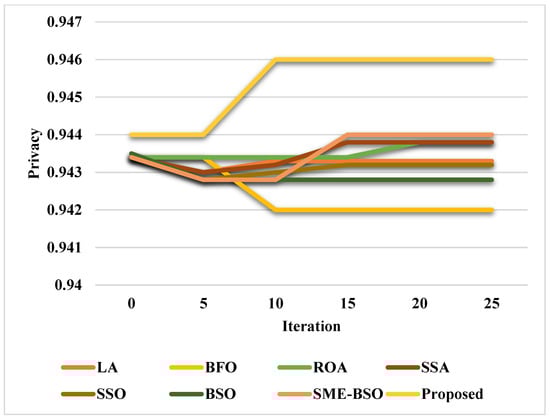Figure 18 and Figure 19 validate and compare the cost function and privacy of the existing [58] and proposed blockchain-based privacy preservation models. Consequently, the statistical analysis is also carried out in this work for validating the results of the optimization integrated blockchain models, as shown in Table 7 and Table 8. Moreover, the improved privacy and utility values ensure the better performance of the security framework. According to the results, it is obvious that the proposed PCGS-based privacy preservation model provides effective results when compared to those of the other algorithms.