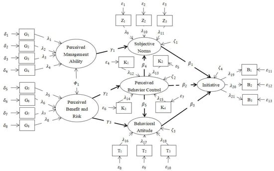 Based on the intention and behavior logic of the cooperation initiatives in the AIUs, this paper uses the structural equation model for verification. The structural equation model includes a structural part and measurement part [87]. The former part reflects internal relationships between the latent variables, while the latter part reflects relationships between observed variables and latent variables [88]. In order to make full use of the prior information of the structural relationships between variables [89], this paper took “initiative”, “subjective norms”, “perceived behavioral control”, “behavioral attitudes”, “management-ability perception”, and “perceived benefits and risk” as latent variables. Each latent variable was reflected by several observable variables. The structural equation model was used to deal with the relationship between latent variables and measurable indicators [90], so it was suitable for establishing the relationship between latent variables to examine the theoretical framework and the research hypotheses shown above.