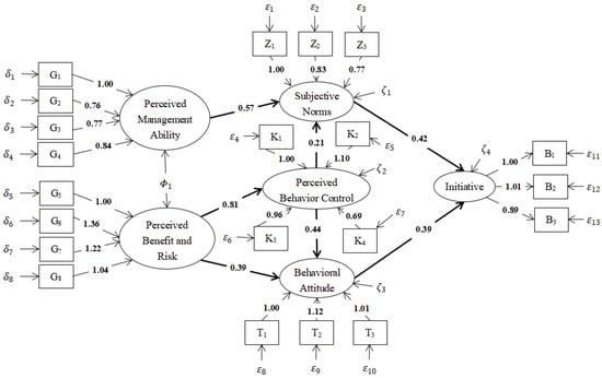 As shown in Table 6, the coefficients of all the observed variables were significant with a 99.9% confidence interval. According to the standardized coefficients, the various coefficients reflecting perceived management ability, perceived benefits and risk, subjective norms, and initiative were not significantly different. They were generally above 0.7. The coefficients of T1 and T3 were 0.699 and 0.686, respectively, reflecting behavioral attitudes. The coefficient of variable K4, reflecting perceived behavior control, was 0.436, which was lower than the other observed variables that reflected the same latent variable.