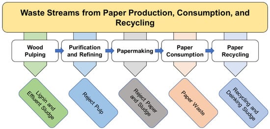 Possible waste streams generated during the lifecycle of paper from wood pulping to paper production, consumption, and recycling.