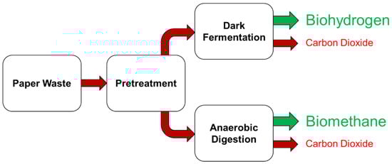 The biohydrogen produced from biomass waste is a renewable source of energy and does not have a negative environmental impact. It has the potential to overcome several environmental issues and the global energy demand [101]. A major barrier in biohydrogen production is the cost, as it has complications in terms of storage, compression, distribution networks, and lack of durable fuel technologies [102]. Hydrogen fuel cells are also costly to set up, delicate, and do not function for extended periods of time [103]. Thermochemical pulping (TMP) is a papermaking process by which wood fibers are treated using hot steam under pressure. TMP results in anaerobically-treated wastewater to produce biohydrogen in a process called dark fermentation (Figure 2) [85]. Dark fermentation is a temperature-sensitive process since a slight shift in temperature can significantly increase or decrease the hydrogen yield; hence, the temperature of wastewater has to be controlled efficiently [104]. A group of researchers used recirculated two-phased anaerobic digestion to produce biohydrogen and biomethane simultaneously from municipal solid waste, 50% of which was paper waste [105]. Anaerobic digestion of paper is one of the major waste management options since it is not economically burdening and offers environmental benefits, producing renewable energy in the form of biomethane. Food waste and paper waste can be digested anaerobically individually (mono-anaerobic digestion) or combined (co-digestion). Co-digestion provides a better yield of methane compared to mono-digestion. Thermophilic (50–60 °C) and mesophilic (30–40 °C) are the two temperature ranges of anaerobic digestion, with thermophilic being better due to high methane gas content, low hydrogen sulfide content, and high rate of organic matter degradation [106]. When waste is anaerobically digested, methane is obtained in a high percentage (50–70%), followed by carbon dioxide and other gases such as hydrogen. Cellulosic wastes generally do not produce high yields of biogases due to their poor biodegradability. To overcome this, paper waste can be co-digested with other organic wastes to increase gas flammability [107]. A study conducted by Priadi et al. (2014) showed that the anaerobic digestion of paper sludge seeded with cow manure produced a significantly high yield of methane (269 mL/g) compared to the anaerobic digestion of paper sludge alone (14.7 mL/g). The treatment of wastewater originating from the paper industry results in large quantities of paper sludge containing chlorinated organics, pathogens, and traces of heavy metals [108]. Wastewater from industrial and municipal sources can be treated by several different anaerobic reactors, such as an up-flow anaerobic filter, modified anaerobic baffled reactor (MABR), or up-flow anaerobic sludge blanket (UASB). UASB is the most commonly used anaerobic reactor for municipal and industrial wastewater treatment since it is stable and consumes energy efficiently. Using this reactor, wastewater containing organic matter released from papermaking or recycling industries can be used to produce biomethane [109].