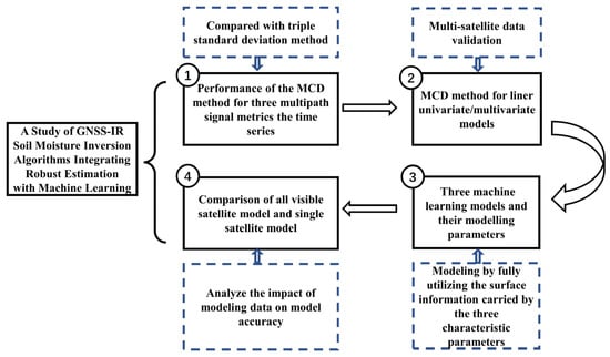The framework and experimental design of the proposed GNSS-IR soil moisture inversion algorithms integrating robust estimation with machine learning.