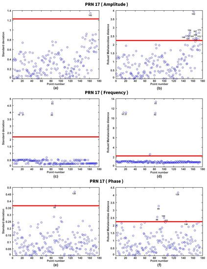 Outlier detection results of the multipath signal metrics time series for PRN 17. (a) Amplitude results of the triple standard deviation method. (b) Amplitude results of the MCD method. (c) Frequency results of the triple standard deviation method. (d) Frequency results of the MCD method. (e) Phase results of the triple standard deviation method. (f) Phase results of the MCD method.
