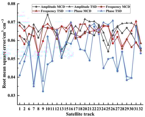 The detection results of the amplitude, frequency, and phase time series for all satellites are shown in Figure 3. Taking the PRN 17 as an example, the ability of two methods to detect outliers is shown in Figure 4. Linear modeling is carried out with the denoised time series of metrics, respectively. RMSE is used to compare the effectiveness of the two robust estimation methods and is shown in Figure 5. Figure 3 shows that the MCD method exhibits stronger detection of multipath signal metric outliers than the method. According to the experimental results, the MCD method can detect not only the outliers already identified using the conventional method but also the outliers missed by the conventional method. Figure 4 shows that the judgment criterion of the MCD method and method, the red line in the figures, can distinguish abnormal values and normal values more clearly. Figure 5 illustrates that the accuracy of the models established with the multipath signal metrics time series, which denoised by using the MCD method, is generally improved. This is further evidence that the triple standard deviation method may be inadequate for detecting certain noise, which may significantly affect the model accuracy. In general, in the GNSS-IR soil moisture inversion study, the triple standard deviation method for outlier detection of the metrics may be susceptible to the effect of outlier masking, which shifts the calculated standard deviation and leads to inaccurate detection results of outliers and missing judgment. The detection of outliers via the MCD method, whose robust Mahalanobis distance is calculated from the mean and covariance matrix of the samples solved iteratively, can greatly reduce the influence of the outliers.