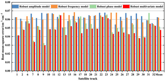 In this section, consistent with above, the inversion results of the PRN 15, 17, 31 satellites are selected as examples. Since the metrics , , and of the multipath signal are all correlated with soil moisture, to fully and effectively utilize the information of multiple characteristics, a robust multiple regression model based on the MCD robust estimation and linear regression method was developed in the manuscript and used to compare the linear regression models of the frequency, amplitude, and phase. Their inversion results are statistically analyzed, as shown in Table 1. The RMSE values of the four models for all visible satellites are also displayed in Figure 6 to demonstrate the validity of the robust multiple regression model.