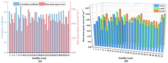 Table 2 and Table 3 show that the correlation coefficient R of the BPNN model is at its maximum value of 0.7065 and the RMSE is at its lowest value of 0.0495 when the number of hidden layers is 6. Therefore, six hidden layer neurons are the ideal quantity for the PRN 31 satellite. The highest BPNN model accuracy is achieved when the ‘Tansig’ function is used as the activation function. Therefore, the ‘Tansig’ function is utilized as the activation function to construct the BPNN inversion model for the PRN 31 satellite at the P043 station. Similarly, the activation functions for other satellites and their numbers of hidden layer neurons can be determined. The ‘Tansig’ function is shown to be the best for all satellite data, although the number of hidden layers is not constant. For instance, 4 and 8 hidden layers are the ideal amount for the PRN 15 and PRN 17 satellites, respectively. The inversion results of all visible satellites with different BPNN models are shown in Figure 7. As shown in Figure 7a, the BPNN algorithms are able to construct the GNSS-IR soil moisture inversion models effectively (R > 0.5) for almost all visible satellites data. Although there is a difference in the optimal number of hidden layers for different satellites, Table 2 demonstrates that the number of hidden layers has little effect on the inversion accuracy. In view of this, to extend the generalizability of the algorithm, we set the number of hidden layers to 6 and compare the performance of the three activation functions when modeling different satellite data. The results are displayed in Figure 7b. As seen in Figure 7b, when the number of hidden layers is set to 6, all three activation functions can effectively establish soil moisture inversion models for different satellite data, and the ‘Tansig’ function has the highest inversion accuracy. Therefore, the six hidden layers and the ‘Tansig’ activation function can be used as the default parameters for BPNN to construct GNSS-IR soil moisture inversion models.