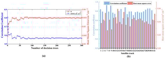 The inversion results of RF models. (a) Inversion results of the different numbers of decision trees for the RF model. (b) The inversion results of all visible satellites with 80 decision trees and 1 node.