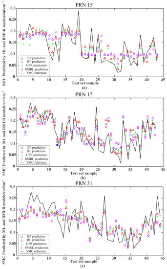 Figure 11 and Table 6 show that the R values of the four models established with the three GPS satellite datasets are in the range of 0.63−0.89, and the RMSE and MAE also basically meet the soil moisture inversion accuracy requirements [24]. For the inversion accuracy of the RF model, GPR model, and BPNN model for PRN 15 compared with that of the multiple linear regression model, the R improved by 33.1%, 24.6%, and 9.5%; the RMSE decreased by 30%, 21.3%, and 7.5%; and the MAE decreased by 30%, 22.6%, and 8%, respectively. For the inversion accuracy of the RF model, GPR model, and BPNN model for PRN 17 compared with that of the multiple linear regression model, the R improved by 11.9%, 7.6%, and 1.6%; the RMSE decreased by 19.2%, 12.8%, and 4.2%; and the MAE decreased by 23.6%, 16.8%, and 7.5%, respectively. For the inversion accuracy of the RF model, GPR model, and BPNN model for PRN 31 compared with that of the multiple linear regression model, the R improved by 32.8%, 27.7%, and 14.5%; the RMSE decreased by 21%, 17%, and 9.7%; and the MAE decreased by 19.5%, 16.4%, and 6.5%, respectively. From Figure 12, the R for all satellite tracks increased by 4.3~86.6% compared with the MCD multiple regression model. The RMSE reduced by 2.8~30%. The results show that all three machine learning inversion models outperform the multiple linear regression model in terms of inversion accuracy. The RF model is the most accurate, the GPR model is the second most accurate, and the BPNN model is the least accurate.
