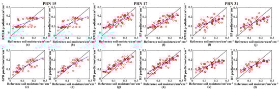 Based on the MCD robust estimation method and machine learning algorithms, machine learning models for moisture inversion were developed and compared with the robust multiple regression model. The relationship between the predicted and reference soil moisture values of the four models is shown in Figure 10.