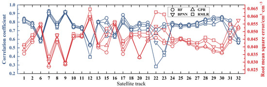 ③ Compared with the robust multiple linear regression model, machine learning algorithms can further enhance the modeling accuracy. The RF model has the highest inversion accuracy, and the R of all satellite tracks are 4.3~86.6% higher than those of the robust multiple linear regression model. The RMSE are 2.8~30% lower than those of the robust multiple linear regression model.