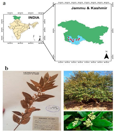 (a) Location map of the study area (real time field observations), (b) representative herbarium specimen and some field photographs of the model plant species (Olea ferruginea).