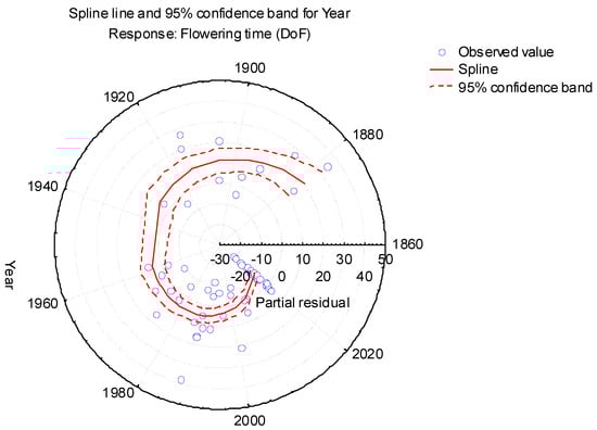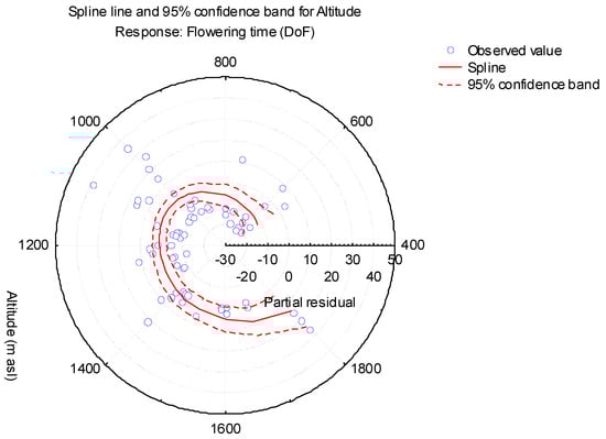 which allows using normal and non-normal distributions along with an additive link function. This allows one to predict flowering-time changes as a response variable with respect to the explanatory variables (year, elevation, and warming temperature). The GAM finally calculated (Equation (2)) the partial residuals as adjusted flowering time thus:
