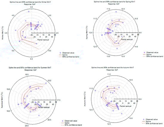 Considering the significant increasing trends of minimum temperature (TMin) for all seasons, their responses on flowering phenology were estimated. The GAM indicated significant (p < 0.01) early flowering with increasing TMin of all seasons except winter (Table 3). The flower phenology was responded significantly (p < 0.01) early at the rate of 6–9 days/1 °C of the summer season and followed by days/1 °C of autumn season and ~3 days/1 °C of the spring season (Figure 4).