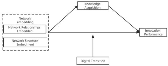 In addition, with the increasing accessibility of knowledge in today’s enterprises, competition among enterprises is becoming increasingly fierce. In order to achieve innovation, enterprises must have sufficient knowledge accumulation, and only then can they lay the foundation for improving innovation performance. Peng (2012) argues that firms play a significant role in driving their innovation strength, performance, and market competitiveness through external learning []. Dyer and Hatch (1998) argue that knowledge acquisition accelerates firms’ product development and improves their ability to adapt to the market, customers, and the environment []. At the same time, knowledge acquisition enables firms to acquire new ideas or perspectives, which can also increase the motivation and incentive among the firm’s employees to participate in and achieve innovation []. The amount of adequate knowledge reserved within a firm is undoubtedly essential, and knowledge acquisition can drive its innovation performance by applying it to the firm’s innovation after absorption and transformation. Therefore, differences in the degree of firms’ embedding in the innovation network will lead to differences in the knowledge acquired between firms, which will further affect firms’ innovation performance. The following hypotheses are proposed in this study: