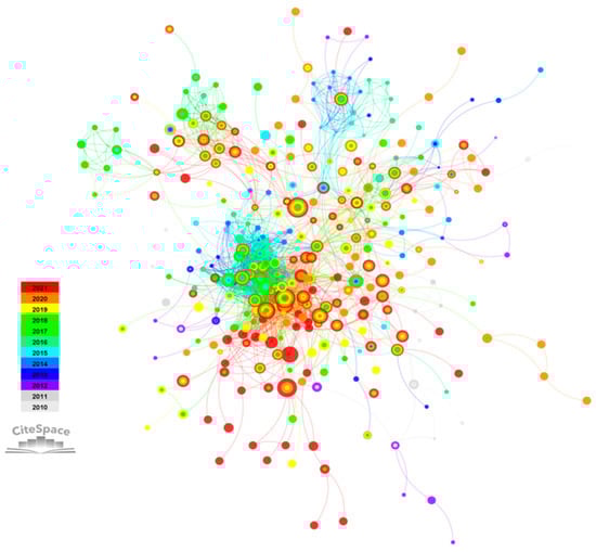 In the fourth step, the metrics were calculated by using the pandas and network packages in Python to construct the relevant networks or models and referring to the degree of centrality calculation used by scholars such as Phelps (2010) [] to go about calculating the degree of centrality in each enterprise’s structural embedding and the frequency of cooperation between enterprises and partners within the network in the relationship embedding. In such studies, when constructing networks, scholars have found that inter-firm partnerships generally last 3–5 years []. Therefore, this study used a 3-year rolling time window to split the innovation network of listed firms engaged in digital technology innovation from 2010–2021 into ten periods (2010–2012, 2011–2013, 2012–2014, …, 2019–2021). The indicators of independent, dependent, moderating, and mediating variables were further calculated using tools such as Python. The cooperative network of enterprises conducting digital technology innovation from 2010–2021 is shown in Figure 2. The enterprises were very closely connected, which provided an essential basis for the subsequent calculation of network embedding indicators.