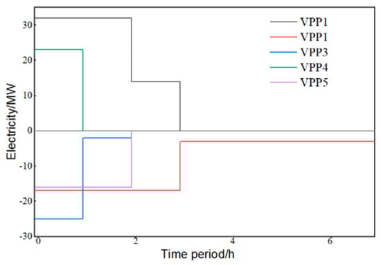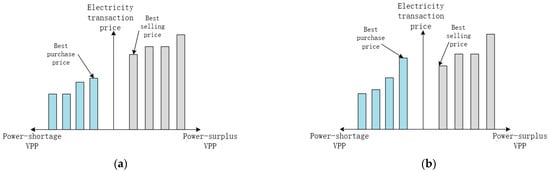 - Each VPP integrates the information of all units in its own region, calculates the interactive power with the outside, determines its initial offer, and then updates its trading price according to current trading status until it reaches the trading goal. After all the power-shortage VPPs have purchased the corresponding power or all the power-surplus VPPs have sold the corresponding power, the remaining power will be traded within the distribution network.