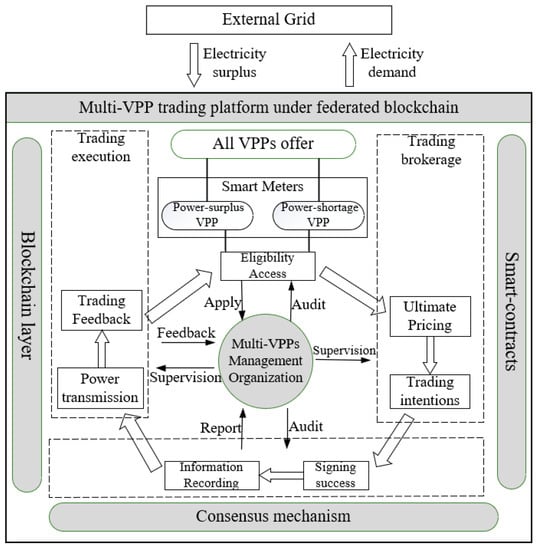- Smart contract. On the platform of a blockchain, after the trading is completed between multi-VPPs, the trading settlement can be automatically executed on the smart contract using electronic signature, thus improving efficiency.