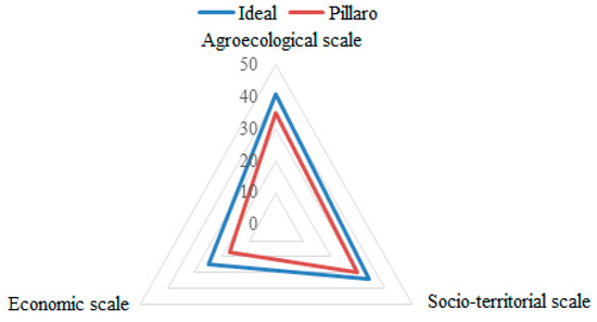 The evaluation of short commercialization circuits was undertaken across three dimensions by comparing an ideal scenario against the agroecological chain in Pillaro. The blue line in Figure 1 indicates the ideal level of sustainability, while the red line indicates the level of sustainability in the territory. The rating of 35.2/41 on the agroecological sustainability scale reflects the finding that each farmer has an approximate land size of 4 hectares, in which there is a diversity of temporary agricultural production, including potatoes and Andean tubers known as mellocos (Ullucus tuberosus), as well as other vegetables and perennial crops such as raspberries and blackberries. In addition, sustainable production techniques such as composting and fumigation with rue or garlic, among others, are used for the cultivation of these items.