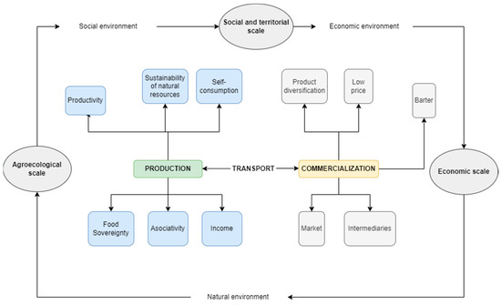 The agroecological system involves three dimensions of sustainability: agroecological, socio-territorial, and economic and is intimately connected to the environmental, social, and economic context. The system can also be described in terms of three main phases: production, commercialization, and distribution (see Figure 2).