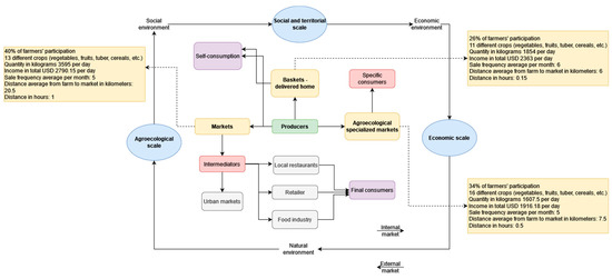 There are three main channels of commercialization in the short commercialization circuit model (traditional markets, specialized fairs, and home-delivery baskets). As discussed above and shown in Figure 3, the system features three interconnected dimensions (agroecological, social, and economic; see Figure 3).